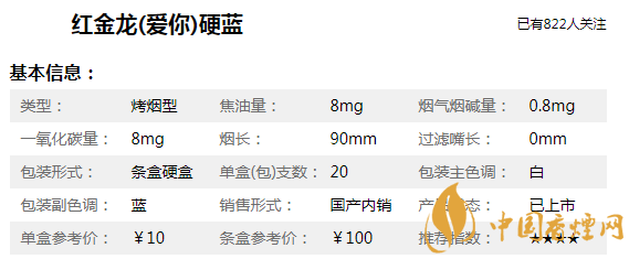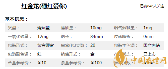 紅金龍(愛你)硬藍(lán)煙身長90mm,焦油含量僅為8mg/支,煙支修長雅致、煙氣淡雅醇厚、口感醇和細(xì)膩。帶給品吸者新鮮有趣的吸食體驗(yàn)和適中的滿足感。吸食口感上,和南京炫赫門比較相似,低焦、低危害對身體危害也要低一些。只不過目前部分地區(qū)已經(jīng)買不到該款煙了,消費(fèi)者要注意甄別真假,以免上當(dāng)受騙。