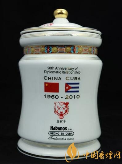 該藏品采用獨(dú)特瓷罐包裝,瓷罐上印有中國(guó)古巴國(guó)旗、中古建交時(shí)間、中國(guó)虎頭圖騰等,并用中文標(biāo)注上了“庚寅年”,罐蓋上附有加溫器,并用軟木做密封。內(nèi)含25支環(huán)徑為52、長(zhǎng)度為 6.4英寸的雙魚(yú)雷型雪茄。全球限量2010罐,此罐編號(hào)為532號(hào),由時(shí)任古巴駐華大使白詩(shī)德(Alberto Jesus Blanco Silva)簽贈(zèng)。