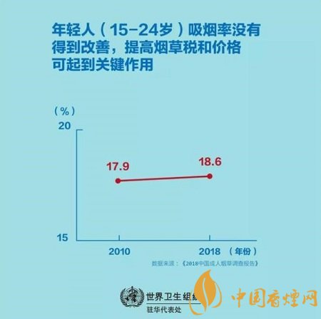 當前吸煙者在注意到煙盒包裝上的健康警示后考慮戒煙的比例沒有變化,2010年為36.4%,而2018年為36.3%。這表明當前的煙盒包裝上的健康警示在警告吸煙的危害方面可能并無效果。更令人擔憂的是,年輕人(15-24歲)的吸煙率沒有得到改善。2010年為17.9%, 而2018年為18.6%,此外,煙草價格仍然很便宜,每包20支卷煙的價格中位數(shù)僅為9.9元(約1.4美元)。