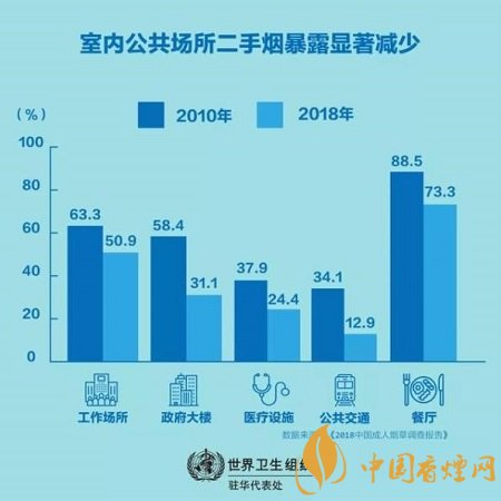 最近發(fā)布的2018年中國成人煙草調查顯示,過去十年中國控煙工作取得了重要進展。與八年前相比,現(xiàn)在中國人遭受二手煙危害的幾率要小很多,室內公共場所二手煙暴露的顯著減少就證明了這一點,比如工作場所(63.3%降至50.9%),政府大樓(58.4%降至31.1%),醫(yī)療設施(37.9%降至24.4%),公共交通(34.1%降至12.9%),甚至餐廳(88.5%降至73.3%)。