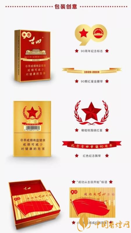 古田金中支90周年紀念版在包裝正面左上角有90周年紀念標志,在煙包腰部位置有90顆紅星組成的金腰帶;在包裝背面有以橄欖枝圍繞的紅星和紅色紀念飄帶;打開煙包可以看見清晰的“成功從古田開始”的標語和小盒側面組成的紅旗圖案。種種設計,巧具匠心,輝映歷史。此時正值歲末年初元旦之際,古田金中支90周年紀念版是紅色卷煙中不可多得的禮贈、過節(jié)佳選。