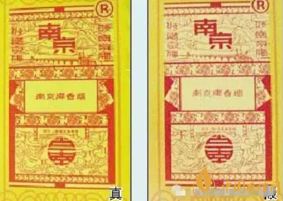 真煙條盒側(cè)面、小盒底部的老南京注冊商標圖案,紅色以外的底色部分發(fā)黃;假煙的老南京注冊商標圖案發(fā)白,圖案模糊。#p#副標題#e#
