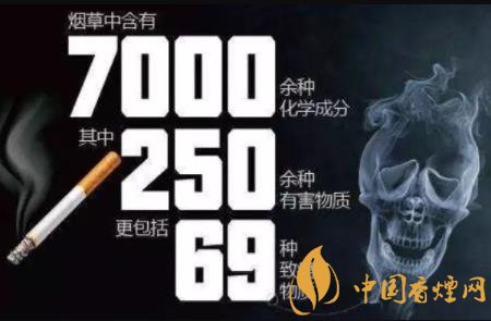 香煙內(nèi)的化學(xué)物質(zhì)主要是干煙草,但是經(jīng)過化學(xué)處理又加了很多添加成份。點(diǎn)燃香煙的煙霧含約4000種化學(xué)物質(zhì),很多是有毒物質(zhì),引致異變物質(zhì)及有數(shù)千種致癌物質(zhì)。香煙內(nèi)常見對身體有毒物質(zhì):尼古丁、鋁、氨/阿摩尼亞、砷、苯、丁烷、鎘、銫、一氧化碳、哥羅芳、氰化物/氰化氫(山埃)、滴滴涕及類似農(nóng)藥、乙醇、甲醛、氰化氫 (山埃類化合物)、鉛、鎂、甲烷、甲醇、水銀(汞)、煙堿 (尼古丁)、石油、焦油、氯乙烯、硝酸鉀。