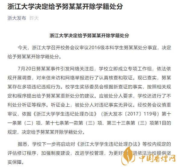 【浙大犯強(qiáng)奸罪學(xué)生被開除學(xué)籍】浙江大學(xué)7月31日深夜發(fā)布消息,努某某在校期間存在多項(xiàng)違紀(jì)違規(guī),浙江大學(xué)決定給予努某某開除學(xué)籍處分,浙大回應(yīng)學(xué)生犯強(qiáng)奸罪獲刑被留校察看,知情人透露其經(jīng)常出入酒吧,成績(jī)很差。下面來看看通報(bào)內(nèi)容!