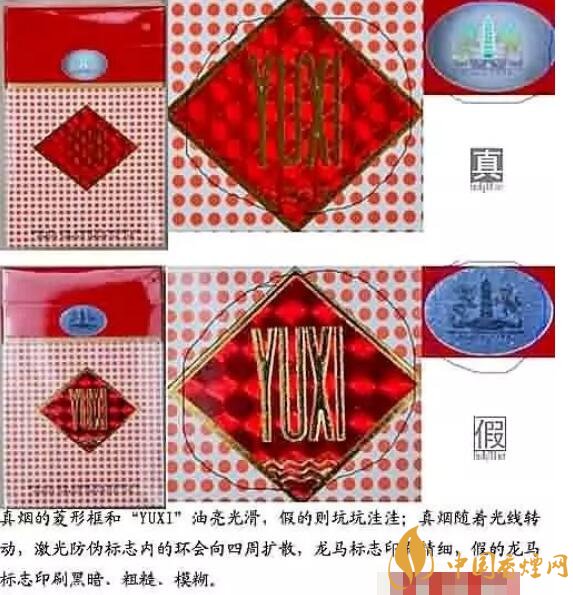 2.外包裝上的“YUXI”標識,真的玉溪煙該標識從不同角度觀察,呈現(xiàn)出不同的圖形,且?guī)缀螆D形完整,邊緣規(guī)則整齊;反之則為假煙。