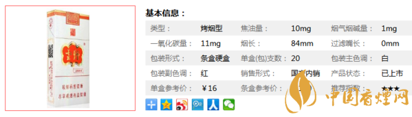 類(lèi)型 :烤煙型 焦油量 :10mg 煙氣煙堿量 :1mg 一氧化碳量 :11mg