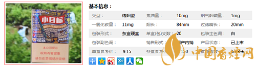 類型 :烤煙型 焦油量 :10mg 煙氣煙堿量 :1mg 一氧化碳量 :11mg