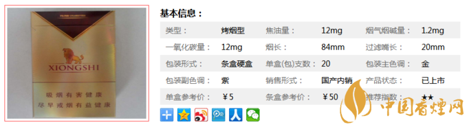 水松紙采用創(chuàng)新的深色設(shè)計(jì),與外包裝顏色配套,文字由原來的橫排改為豎排,并采用銀色燙金工藝,使煙支的外觀更加精致,煙支結(jié)構(gòu)和材料搭配科學(xué)合理。下面我們一起來看雄獅新的參數(shù)信息:焦油量:12mg 煙堿量:1.2mg 一氧化碳量:12mg