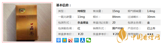 類型 :烤煙型 焦油量 :15mg 煙氣煙堿量 :1.4mg 一氧化碳量 :13mg