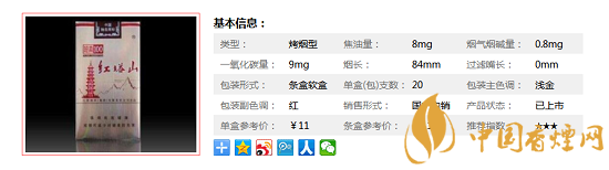 類型 :烤煙型 焦油量 :8mg 煙氣煙堿量 :0.8mg 一氧化碳量 :9mg