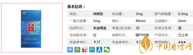 | 煙長(zhǎng):84mm | 過(guò)濾嘴長(zhǎng):25mm | 包裝形式:條盒硬盒 | 單盒(包)支數(shù):20 |