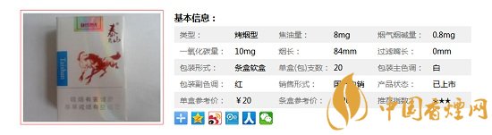 類型 :烤煙型 焦油量 :8mg 煙氣煙堿量 :0.8mg 一氧化碳量 :10mg
