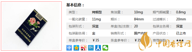 牡丹軟藍(lán),煙支長(zhǎng)84mm,過(guò)濾嘴長(zhǎng)20mm,軟包包裝首創(chuàng)運(yùn)用絨面印刷工藝,更具質(zhì)感,更顯優(yōu)雅,并將花型悉心勾勒,同時(shí)增加的金線(xiàn),在一抹懷舊藍(lán)的映襯下精致感倍增。下面我們一起來(lái)看牡丹軟藍(lán)的參數(shù)信息:焦油量:10mg. 煙堿量:0.8mg. 一氧化碳量:11mg.