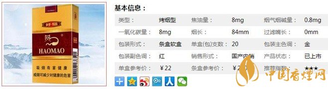 好貓(富貴)”8mg低焦新品。以高香氣、低焦油、低危害為主要設(shè)計(jì)方向,運(yùn)用純天然植物提取液,突出 “醇、香、舒、雅”的吸食特點(diǎn),帶來潤澤如玉般的吸食享受。點(diǎn)燃品吸,但覺香味醇和,本香與調(diào)香協(xié)調(diào)一致,沒有淡薄之感,少有燥辣之氣,煙氣粒子雖不夠細(xì)膩,但刺激適度,且隱隱約約伴有一絲蒼勁和飄逸,給感官帶來較為舒適的體驗(yàn)