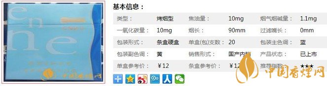 類型 :烤煙型 焦油量 :10mg 煙氣煙堿量 :1.1mg 一氧化碳量 :10mg
