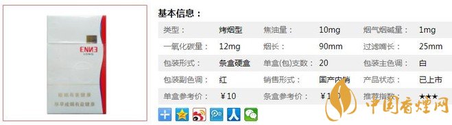 類型 :烤煙型 焦油量 :10mg 煙氣煙堿量 :1mg 一氧化碳量 :11mg