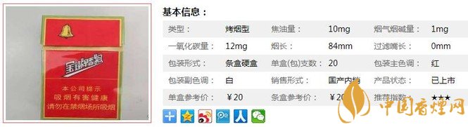 類型 :烤煙型 焦油量 :10mg 煙氣煙堿量 :1.1mg 一氧化碳量 :12mg