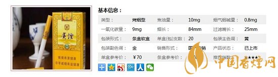類型 :烤煙型 焦油量 :9mg 煙氣煙堿量 :0.9mg 一氧化碳量 :10mg