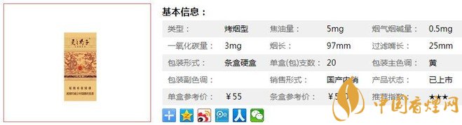 類型 :烤煙型 焦油量 :5mg 煙氣煙堿量 :0.5mg 一氧化碳量 :3mg