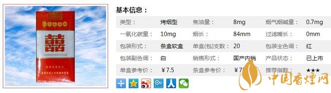 | 類型 :烤煙型 | 焦油量 :8mg | 煙氣煙堿量 :0.7mg | 一氧化碳量 :10mg |