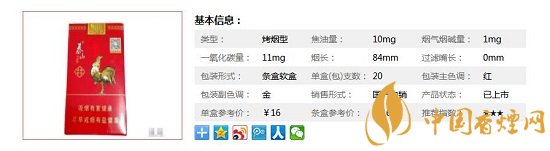 類型 :烤煙型 焦油量 :10mg 煙氣煙堿量 :1mg 一氧化碳量 :11mg