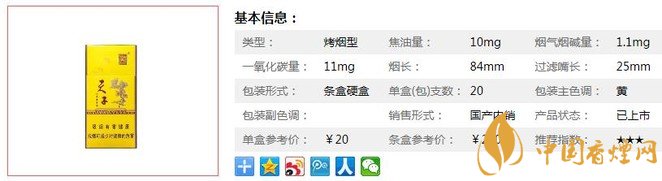 類(lèi)型 :烤煙型 焦油量 :10mg 煙氣煙堿量 :1mg 一氧化碳量 :10mg