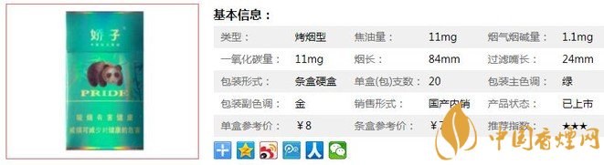 類型 :烤煙型 焦油量 :11mg 煙氣煙堿量 :1.1mg 一氧化碳量 :11mg