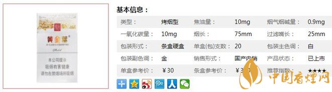 類型 :烤煙型 焦油量 :10mg 煙氣煙堿量 :0.9mg 一氧化碳量 :10mg