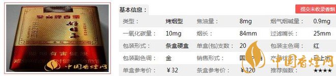 | 煙長(zhǎng):84mm | 過(guò)濾嘴長(zhǎng):25mm | 包裝形式:條盒硬盒 | 單盒(包)支數(shù):20 |