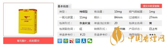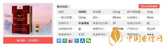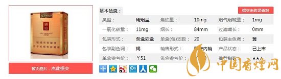 類型 :烤煙型 焦油量 :11mg 煙氣煙堿量 :1.1mg 一氧化碳量 :12mg