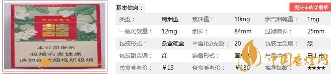 類型 :烤煙型 焦油量 :10mg 煙氣煙堿量 :1mg 一氧化碳量 :12mg
