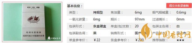 類型 :烤煙型 焦油量 :6mg 煙氣煙堿量 :0.6mg 一氧化碳量 :6mg