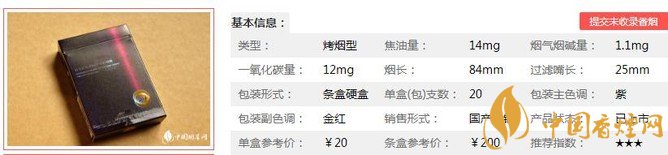 類型 :烤煙型 焦油量 :14mg 煙氣煙堿量 :1.1mg 一氧化碳量 :12mg