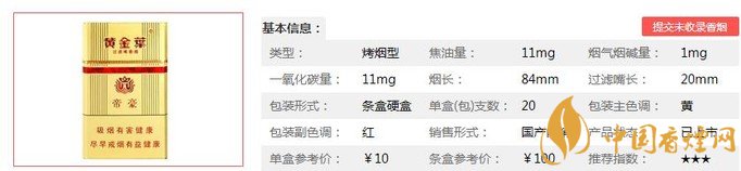 類(lèi)型 :烤煙型 焦油量 :10mg 煙氣煙堿量 :1mg 一氧化碳量 :10mg