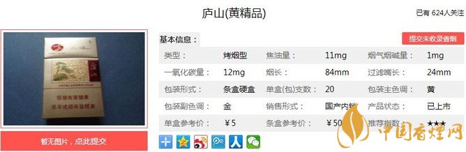 廬山黃精品煙葉選料考究。以全國著名煙葉品牌“紫石”為主要原料,產(chǎn)地出自高海拔山區(qū),日照時間長、天然無污染。經(jīng)香煙網(wǎng)小編市場調(diào)查廬山黃精品售價為5元/包。