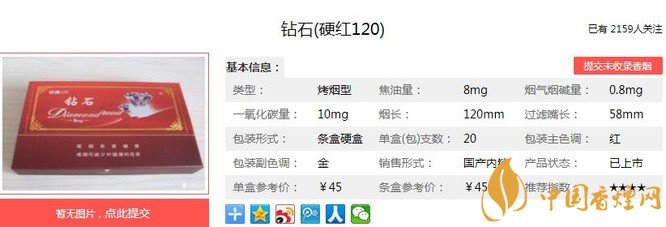對所有原料進行科學的理化分析,選用了香氣足、煙堿高、焦油低的巴西、津巴布韋及國內(nèi)優(yōu)質且自然醇化的煙葉。香煙價位中等,質量比較不錯,在市場上獲得高端消費者的認同和追捧。經(jīng)香煙網(wǎng)小編市場調(diào)查鉆石硬紅120售價為45元/包。