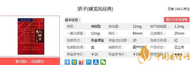 以上便是由香煙網(wǎng)小編為大家介紹的關(guān)于嬌子硬龍鳳經(jīng)典價(jià)格及參數(shù) 嬌子硬龍鳳經(jīng)典獨(dú)家口感分析的相關(guān)信息,想要了解更多有關(guān)內(nèi)容請(qǐng)點(diǎn)擊:嬌子軟龍鳳呈祥售價(jià)10元一包 煙氣細(xì)膩口感舒適
