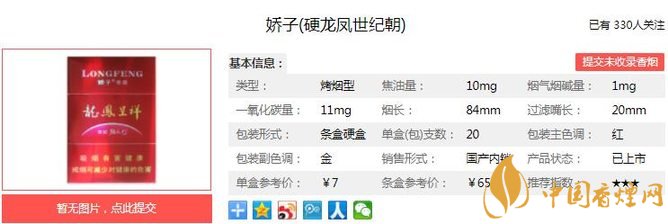 嬌子硬龍鳳世紀朝煙支長84mm,過濾嘴長20mm,金色內襯紙紋路非常細膩,煙支7-6-7排列,煙嘴印有紅色龍鳳呈祥和金色世紀朝字樣。下面我們一起來看嬌子硬龍鳳世紀朝的參數信息:焦油量:10mg 煙堿量:1.0mg 一氧化碳量:11mg