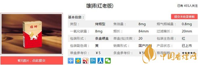 雄獅紅老版口感及參數(shù) 5元檔卷煙的領跑者