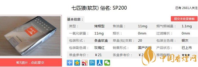 七匹狼軟灰亦稱七匹狼(SP200),精選國內(nèi)外優(yōu)質(zhì)烤煙,人工片選精華,運用國際先進的無氟及過濾技術(shù)、HXD烘絲工藝,由全新的國際一流廠房和設(shè)備精工制作,氣質(zhì)卓越優(yōu)雅,品味自然純正,煙草本香流露無遺,是比較經(jīng)典的具有較高性價比的狼煙。經(jīng)香煙網(wǎng)小編市場調(diào)查七匹狼軟灰售價為21元/包。