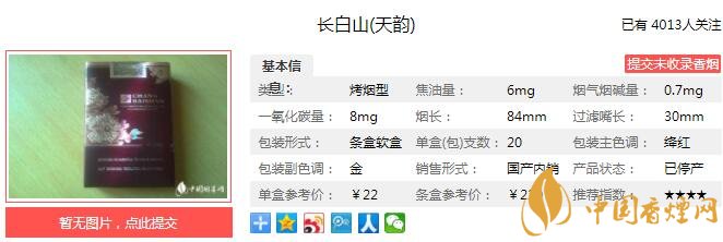 以上便是由香煙網(wǎng)小編為大家介紹的關(guān)于長白山天韻多少錢一包 長白山天韻口感及參數(shù)介紹的相關(guān)信息,想要了解更多有關(guān)內(nèi)容請點擊:白沙硬細支和氣生財好抽嗎 和氣生財價格及參數(shù)介紹