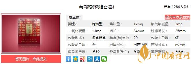黃鶴樓(硬雅香喜)煙支長84mm,過濾嘴長25mm。黃色濾嘴上影印了與煙盒相同的文字圖案,濾嘴下端,豎排印刷的品名“黃鶴樓”與黃鶴樓的圖標分居前后兩側,“Huanghelou”的拼音則印在一條較粗的紅圈上。下面我們一起來看黃鶴樓(硬雅香喜)的參數信息:焦油量:12mg 煙堿量:1.0mg 一氧化碳量:13mg