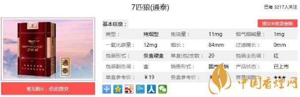 七匹狼(通泰)的煙氣還是屬于比較濃重的那一種,這也是一直以來七匹狼香煙的典型特征。降焦并不是非常的明顯,但是該有的口感和煙氣還是可以保留的很好。參數(shù)大致如下,焦油量:11mg煙堿量:1.0mg一氧化碳量:12mg.