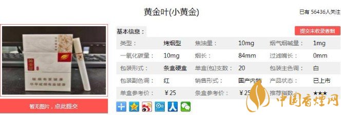 黃金葉(小黃金)包裝精致好看,于細(xì)微處見精彩,體現(xiàn)了產(chǎn)品的時尚亮點(diǎn)與現(xiàn)代科技成果的運(yùn)用??诟蟹矫?,吸阻適中,燃速均勻,基本上每一口煙氣都是飽滿滑潤,香氣濃郁。這樣的價格能有這樣的口感,可以說是非常不錯了,挑不出明顯的不足來。下面跟著香煙網(wǎng)小編一起來了解黃金葉(小黃金)的相關(guān)信息吧。