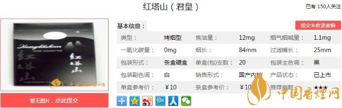 君皇潔白的煙支,非常的漂亮美觀,沉穩(wěn)神秘的濾嘴上有兩道銀邊,裝飾一下感覺瞬間就有了國(guó)際范。亮銀色的品名環(huán)繞其上,潔白的松紋里緊湊的包裹著金黃油亮的煙絲,整潔的條絲,還有塊狀的梗片,非常的好看。下面便是紅塔山(君皇)的基本參數(shù):焦油量:12mg 煙堿量:1.1mg 一氧化碳量:11mg.
