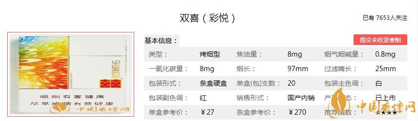 這款煙在廣東反而不多見,包裝簡(jiǎn)約之中有炫目多彩的時(shí)尚氣息。雙喜彩悅沒有降低煙氣的凹槽,也無兩排細(xì)細(xì)的降焦線,絕對(duì)的素面朝天。香煙價(jià)位中等,但是質(zhì)量比較不錯(cuò),值得一品。經(jīng)調(diào)查雙喜彩悅售價(jià)為27元/包。