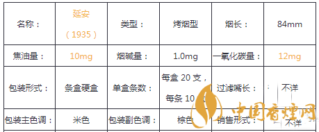 在了解了延安香煙最貴的多少錢之后,為了大家能更詳見的了解此煙,小編特意將延安1935香煙的核心參數(shù)進(jìn)行了整理,以便于對它進(jìn)行更深入的了解。