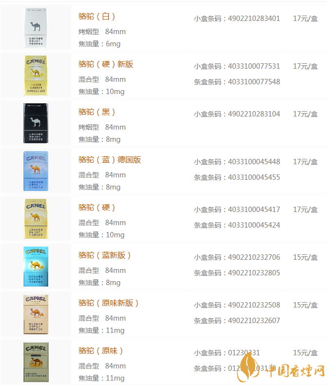 駱駝香煙品種包括了,駱駝(無(wú)嘴)、駱駝(軟黃)、駱駝(原味中免)、駱駝(藍(lán)中免)、駱駝(薄荷)、駱駝(特醇俄版)、駱駝(八角藍(lán))、駱駝(硬藍(lán)99s)、駱駝(硬黃99s)等。