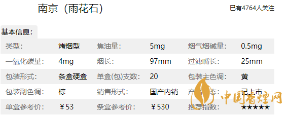 類型 :烤煙型 焦油量 :5mg 煙氣煙堿量 :0.5mg 一氧化碳量 :4mg