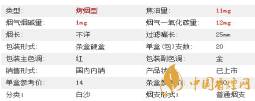 類型 :烤煙型 焦油量 :11mg 煙氣煙堿量 :1mg 一氧化碳量 :12mg